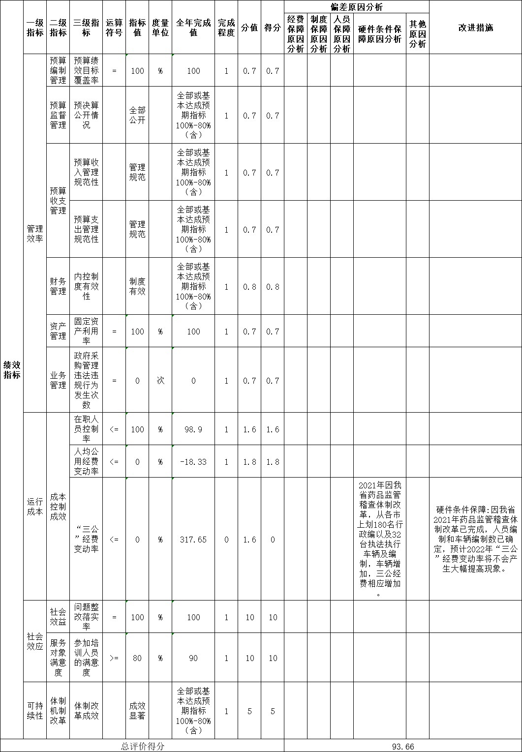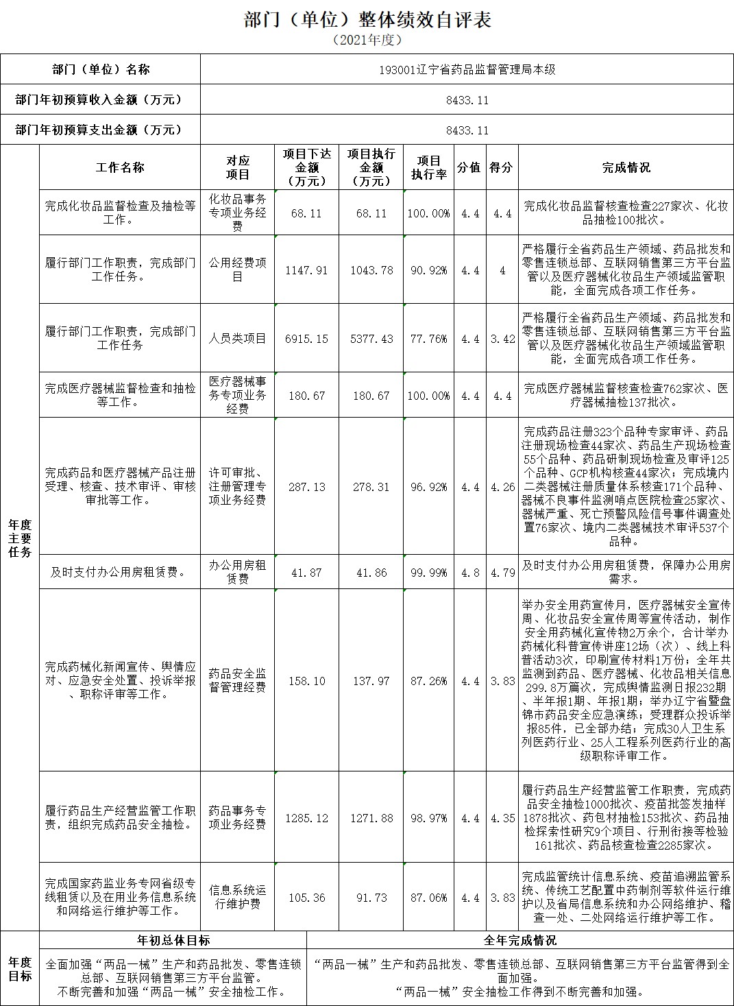 (1)绩效自评情况。根据预算绩效管理要求,组织对1个单位开展整体绩效自评,涉及资金8433.11万元,自评平均分93.66分。