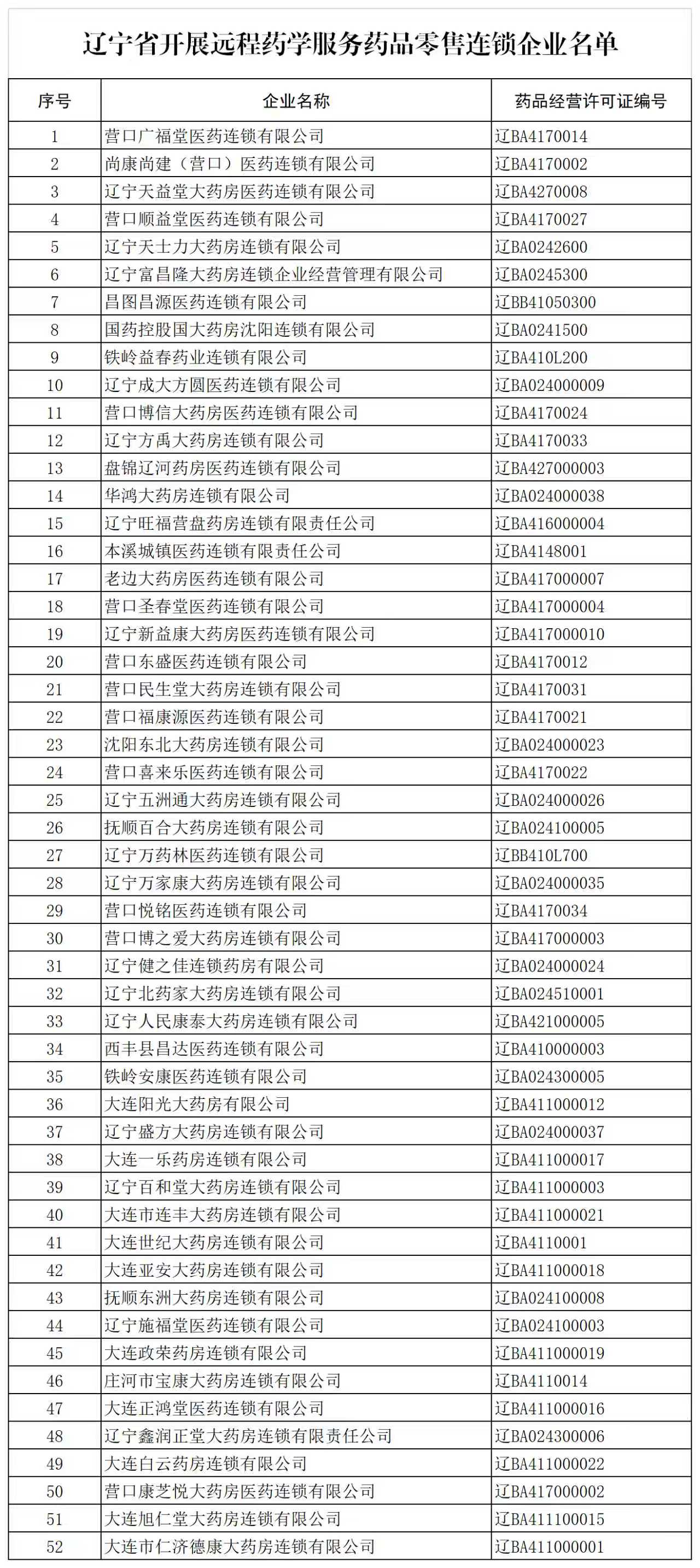 辽宁省开展远程药学服务药品零售连锁企业名单